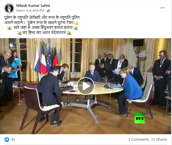 सोशल मीडिया पर एक वीडियो शेयर कर दावा किया जा रहा है कि यूक्रेन के राष्ट्रपति वोलोदिमिर जेलेंस्की ने रूस के राष्ट्रपति व्लादिमीर पुतिन के सामने आत्मसमर्पण कर दिया है।
