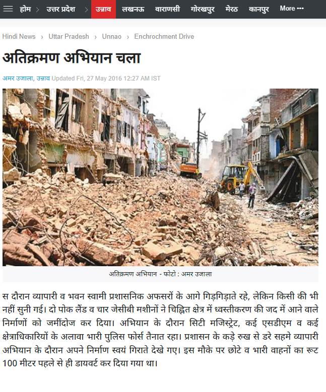 इससे मदद लेते हुए हमने ‘उन्नाव अतिक्रमण अभियान चला’ कीवर्ड को गूगल पर सर्च किया। हमेंं अमर उजाला द्वारा 27 मई 2016 को प्रकाशित एक रिपोर्ट प्राप्त हुई। रिपोर्ट के मुताबिक, यूपी के उन्नाव में छोटा चौराहा से अताउल्ला नाला रोड पर अतिक्रमण अभियान चला था। मौके पर सिटी मजिस्ट्रेट, कई उपजिलाधिकारी, कई सीओ, कई थानों की पुलिस फोर्स व पीएसी बल मौजूद रहे। अमर उजाला की रिपोर्ट में एक तस्वीर संलग्न है, जो सोशल मीडिया पर वायरल तस्वीर से काफी मिलती जुलती है।