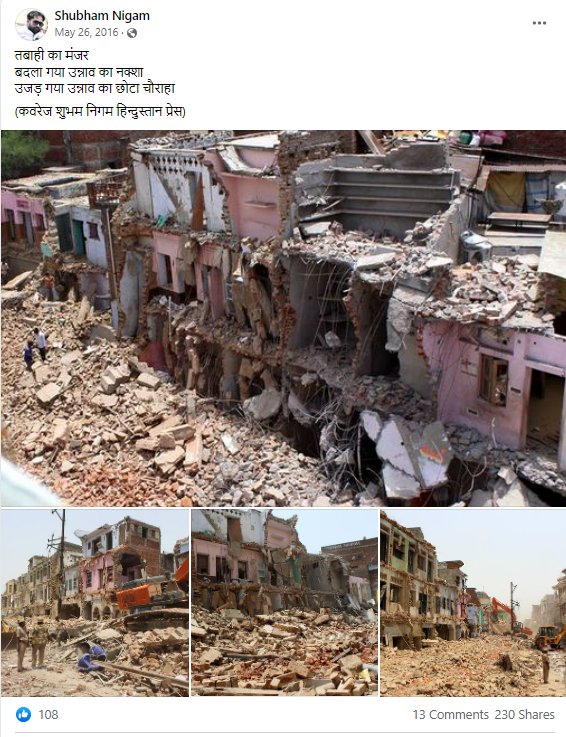 पड़ताल के दौरान हमने फेसबुक पर ‘छोटा चौराहा उन्नाव’ सर्च किया। इस कड़ी में हमें Shubham Nigam नामक एक फेसबुक यूजर द्वारा 26 मई 2016 को किया गया एक पोस्ट प्राप्त हुआ। उन्होंने पोस्ट के कैप्शन में लिखा है, “तबाही का मंजर, बदला गया उन्नाव का नक्शा। उजड़ गया उन्नाव का छोटा चौराहा (कवरेज शुभम निगम हिन्दुस्तान प्रेस)।” Shubham Nigam ने अपने इस फेसबुक पोस्ट में चार तस्वीरें अपलोड की हैं।