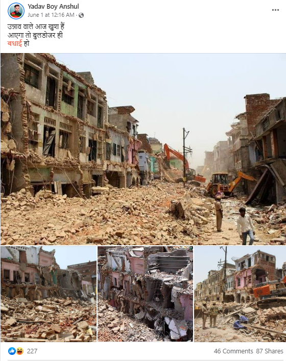 इसी बीच सोशल मीडिया पर कुछ तस्वीरों का एक कोलाज शेयर कर दावा किया गया है कि ये तस्वीरें उन्नाव की हैं, जहां योगी आदित्यनाथ की सरकार ने बुलडोजर चलाकर अतिक्रमण हटा दिया है।