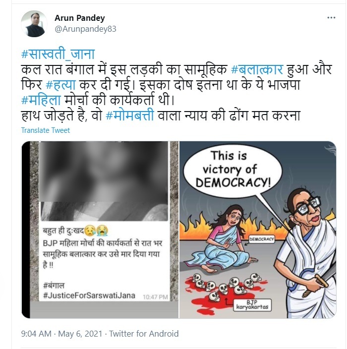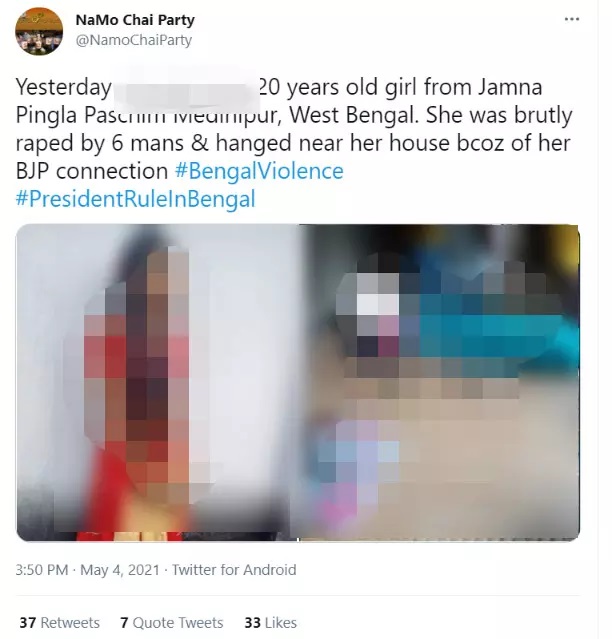 पश्चिम बंगाल चुनाव में TMC की जीत के बाद राज्य में महिलाओं के साथ हिंसा की कई खबरें सुर्खियों में हैं। इसी बीच सोशल मीडिया पर भाजपा महिला मोर्चा की कार्यकर्ता के नाम पर एक तस्वीर वायरल हो रही है। दावा है कि यह तस्वीर पश्चिमी मिदनापुर जिले में रहने वाली एक लड़की की है जिसका सामूहिक बलात्कार कर हत्या कर दी गई। साथ ही कहा जा रहा है कि इस लड़की का दोष सिर्फ इतना था कि ये भाजपा महिला मोर्चा की कार्यकर्ता थी।