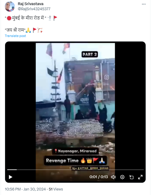 वायरल वीडियो करीब 13 सेकेंड का है. इस वीडियो में कुछ लोग एक मस्जिद की मीनार पर चढ़कर भगवा झंडा लहराते हुए दिखाई दे रहे हैं. इसके अलावा, वीडियो के बैकग्राउंड में एक ट्रैक भी मौजूद है. साथ ही वीडियो में लोकेशन के तौर पर नयानगर मीरारोड भी लिखा हुआ है.