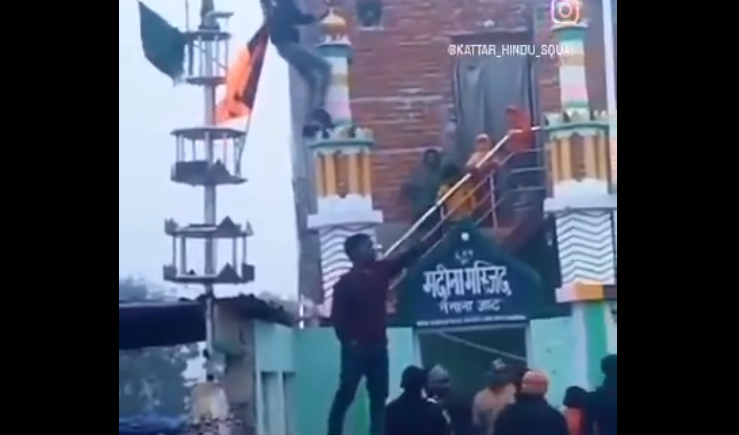 सोशल मीडिया एक वीडियो वायरल हो रहा है, जिसमें कुछ युवक एक मस्जिद पर भगवा झंडा लहराते हुए दिखाई दे रहे हैं. वीडियो को मुंबई के मीरा रोड हिंसा से जोड़कर शेयर किया जा रहा है.