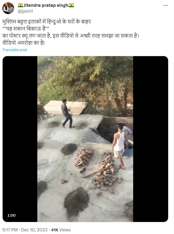 वीडियो को ट्विटर पर एक ख़ास कैप्शन के साथ शेयर किया गया है, जिसमें लिखा हुआ है “मुस्लिम बहुल इलाकों में हिन्दुओ के घरों के बाहर “यह मकान बिकाऊ है” का पोस्टर क्यू लग जाता है, इस वीडियो से अच्छी तरह समझा जा सकता है। वीडियो अमरोहा का है!”