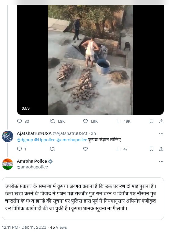 अमरोहा पुलिस ने ट्वीट के जवाब में लिखा है, “उक्त प्रकरण दो माह पुराना है. ठेला खड़ा करने के विवाद में प्रथम पक्ष राजबीर पुत्र राम चरन व द्वितीय पक्ष नौरतन पुत्र चन्द्रसैन के मध्य झगड़े की सूचना पर पुलिस द्वारा पूर्व में नियमानुसार अभियोग पंजीकृत कर विधिक कार्यवाही की जा चुकी है”.