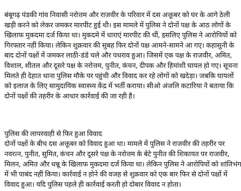 जांच में हमें इस संबंध में अमर उजाला की वेबसाइट पर 14 अक्टूबर 2023 को प्रकाशित रिपोर्ट भी मिली. इस रिपोर्ट में घटना की विस्तृत जानकारी दी गई है. रिपोर्ट के अनुसार, 10 अक्टूबर 2023 को बंबूगढ़ गांव के रहने वाले नरोत्तम और राजवीर के परिवारजनों के बीच घर के आगे ठेली खड़ा करने को लेकर विवाद हुआ था. इस दौरान दोनों पक्षों के बीच मारपीट भी हुई थी. पुलिस ने इस मामले में दोनों पक्षों के आठ लोगों के खिलाफ मुकदमा दर्ज किया, लेकिन कोई गिरफ्तारी नहीं की.