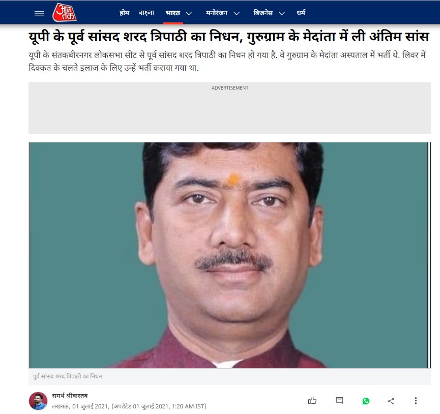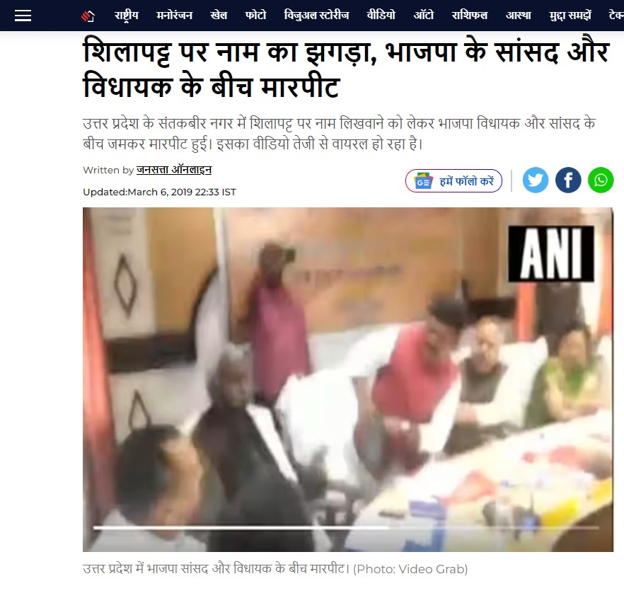 हमें उस दौरान जांच में मार्च 2019 में आजतक और जनसत्ता की वेबसाइट पर प्रकाशित रिपोर्ट मिली थी. इन रिपोर्टों के अनुसार, यह पूरा मामला उत्तर प्रदेश के संत कबीर नगर जिले का था. जहां विकास कार्यों को लेकर अधिकारियों और जनप्रतिनिधियों की बैठक चल रही थी. इसमें तत्कालीन भाजपा सांसद शरद त्रिपाठी और स्थानीय भाजपा विधायक राकेश सिंह बघेल भी मौजूद थे.