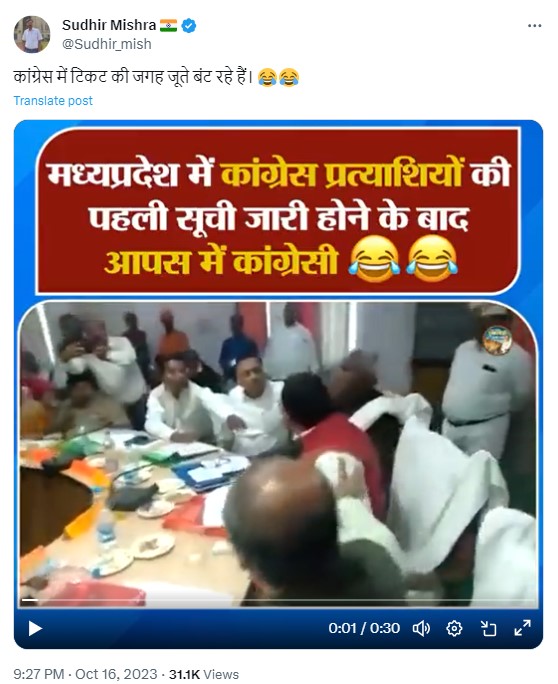 सोशल मीडिया पर एक बैठक में दो नेताओं के बीच मारपीट और जूते चलने का वीडियो आने वाले मध्यप्रदेश विधानसभा चुनाव से जोड़कर शेयर किया जा रहा है. वायरल दावे में कहा जा रहा है कि मध्य प्रदेश में कांग्रेस प्रत्याशियों की पहली सूची ज़ारी होने के बाद कांग्रेसी नेता आपस में ही भिड़ गए.