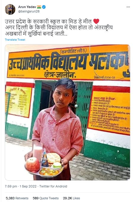 बीजेपी नेता और हरियाणा बीजेपी आईटी सेल के पूर्व प्रभारी अरुण यादव ने तस्वीर को ट्वीट कर दावा किया कि यह यूपी के सरकारी स्कूल का मिड डे मील है।