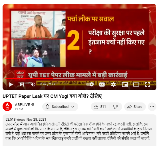 इसके अलावा, हमें एबीपी लाइव के यूट्यूब अकाउंट पर 28 नवंबर 2021 को अपलोड की गई वीडियो रिपोर्ट मिली. इस वीडियो में भी वे UPTET पेपर लीक होने का ज़िक्र करते हुए आरोपियों को गिरफ्तार करने वाले और पेपर निरस्त करने की बात कर रहे थे.