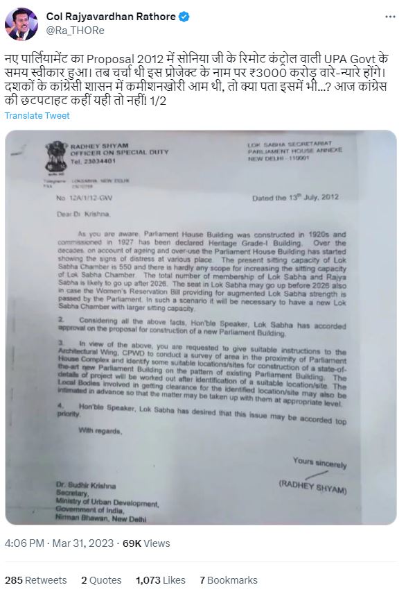यूपीए सरकार ने साल 2012 में 3000 करोड़ रुपये की लागत से नया संसद भवन बनाने का प्रस्ताव रखा था।