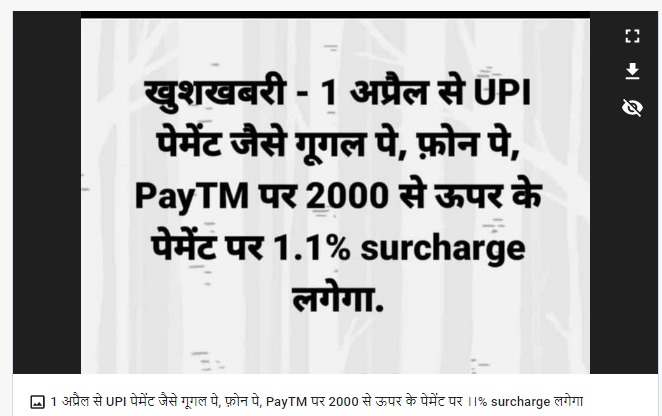 सोशल मीडिया पर एक पोस्ट शेयर कर दावा किया जा रहा कि 1 अप्रैल से आम लोगों को 2000 से अधिक यूपीआई पेमेंट करने पर 1.1 फीसदी का चार्ज देना होगा। कहा जा रहा कि ‘गूगल पे’, ‘पेटीएम’ जैसे डिजिटल माध्यमों की मदद से दो हजार से अधिक का UPI पेमेंट करने पर अब शुल्क देना पड़ सकता है।