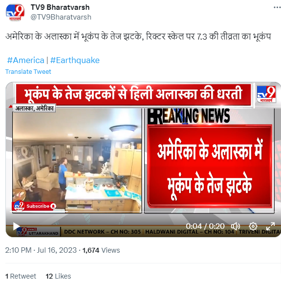 CNN द्वारा 16 जुलाई, 2023 को प्रकाशित लेख के अनुसार अमेरिका के अलास्का में भूकंप के तेज झटके महसूस किए गए हैं. रिक्टर पैमाने पर भूकंप की तीव्रता 7.2 मापी गई है. इसी क्रम में News24, TV9 भारतवर्ष तथा सोशल मीडिया यूजर्स ने एक वीडियो शेयर कर यह दावा किया कि अमेरिका के अलास्का में भूकंप के तेज झटके महसूस किए गए.
