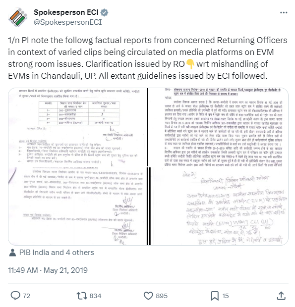 पड़ताल के दौरान हमें चुनाव आयोग के प्रवक्ता के आधिकारिक X अकाउंट से 21 मई 2019 को इस संबंध में किया गया ट्वीट भी मिला. इस ट्वीट में जिला निर्वाचन अधिकारी चंदौली और समाजवादी पार्टी के लेटरहेड से दिया गया बयान भी मौजूद था. दोनों ही लेटरहेड में मौजूद बयान में किसी भी तरह की अनियमितता का ज़िक्र नहीं था.