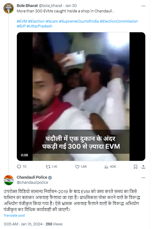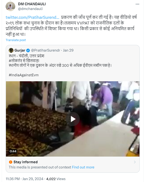 डीएम चंदौली ने जवाब देते हुए लिखा, “यह वीडियो वर्ष 2019 लोकसभा चुनाव के दौरान का है. तत्समय VVPAT को राजनीतिक दलों के प्रतिनिधियों की उपस्थिति में शिफ्ट किया गया था. किसी प्रकार से कोई अनियमित कार्य नहीं हुआ था.”