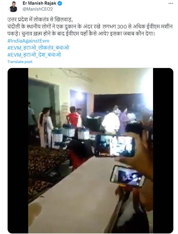 उक्त वीडियो को सोशल मीडिया खासकर X (पूर्व में ट्विटर) पर वायरल दावे वाले कैप्शन के साथ शेयर किया गया है, जिसमें लिखा हुआ है “उत्तर प्रदेश में लोकतंत्र से खिलवाड़, चंदौली के स्थानीय लोगों ने एक दुकान के अंदर रखे लगभग 300 से अधिक ईवीएम मशीन पकड़े. चुनाव ख़त्म होने के बाद ईवीएम यहाँ कैसे आये? इसका जबाब कौन देगा.”