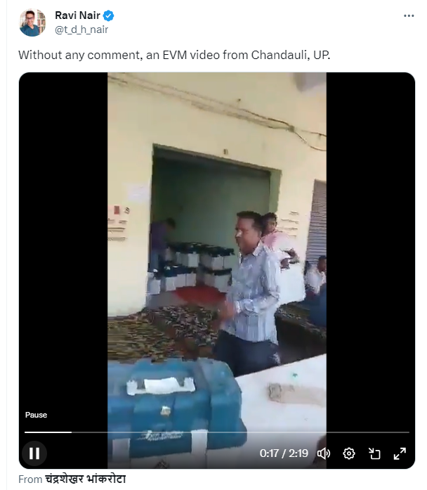 सोशल मीडिया पर एक वीडियो वायरल हो रहा है, जिसमें कुछ लोग एक जगह पर ईवीएम (EVM) रखते दिखाई दे रहे हैं. वीडियो को सोशल मीडिया पर इस दावे से शेयर किया जा रहा है कि “उत्तर प्रदेश के चंदौली में ईवीएम मशीन पकड़े गए हैं”.