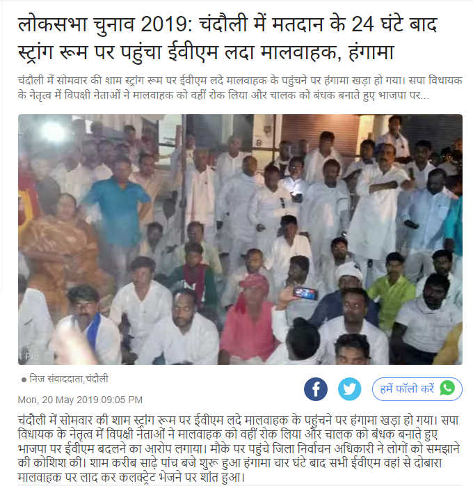 रिपोर्ट के अनुसार, 19 मई 2019 को चंदौली लोकसभा क्षेत्र में मतदान के एक दिन बाद 20 मई को नवीन कृषि मंडी में बने स्ट्रांग रूम में ईवीएम (EVM) से लदा एक वाहन पहुंचा था. वाहन देखते ही वहां मौजूद तत्कालीन सपा-बसपा गठबंधन के कार्यकर्ताओं ने ईवीएम बदलने का आरोप लगाते हुए हंगामा शुरू कर दिया.