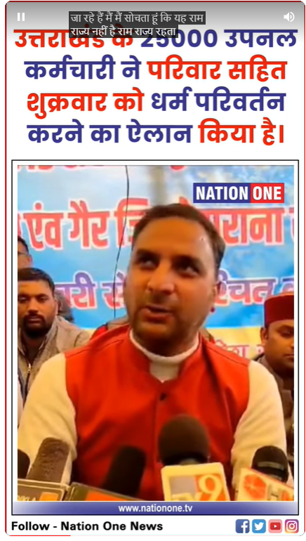 सोशल मीडिया पर एक वीडियो वायरल हो रहा है, जिसमें एक व्यक्ति धर्म परिवर्तन करने की बात कहता हुआ दिख रहा है. इस वीडियो को शेयर कर दावा किया गया है कि उत्तराखंड के 25000 उपनल कर्मचारियों ने इस्लाम छोड़ने का ऐलान किया.