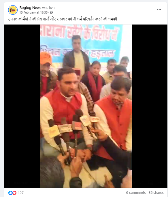 जांच में हमें Roglog News नाम के फेसबुक पेज से 15 फ़रवरी 2024 को लाइव किया गया एक वीडियो मिला. करीब 6 मिनट लंबे इस वीडियो में हमें अंत में वह हिस्सा सुनाई दिया, जो वायरल वीडियो में मौजूद है. पूरे वीडियो को सुनने पर हमने पाया कि पहले विनोद गोदियाल ने उपनल कर्मचारियों की सभी मांगे मीडिया के सामने रखी. इसके बाद उन्होंने कहा कि “यह राम राज्य नहीं है. इसलिए हम सभी 25000 कर्मचारियों ने निर्णय लिया है कि हमने अपने परिवार के साथ धर्म परिवर्तन करेंगे”.