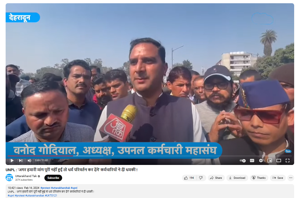 पड़ताल के दौरान हमें उत्तराखंड तक के यूट्यूब अकाउंट पर 16 फ़रवरी 2024 को अपलोड किया गया एक वीडियो मिला. इस वीडियो में हमें वह व्यक्ति दिखाई दिया, जो वायरल वीडियो में मौजूद है. इस रिपोर्ट में उक्त शख्स को उपनल कर्मचारी महासंघ का अध्यक्ष विनोद गोदियाल बताया गया था. इस वीडियो में भी विनोद गोदियाल ने मांगे नहीं पूरी होने धर्म परिवर्तन की बात कही थी.
