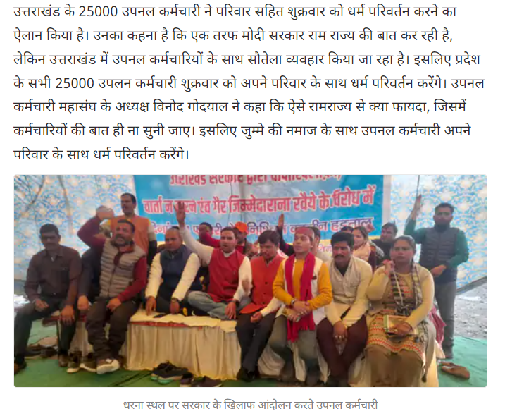 दैनिक भास्कर की रिपोर्ट के अनुसार, उत्तराखंड के अलग-अलग विभागों में काम कर रहे उत्तराखंड पूर्व सैनिक कल्याण निगम (उपनल) के करीब 25000 कर्मचारियों ने नियमितीकरण सहित वेतनमान बढ़ाने की मांग को लेकर देहरादून में धरना दिया था. धरने के दौरान मांगों पर सुनवाई नहीं होने से नाराज होकर उपनल कर्मचारी महासंघ के अध्यक्ष विनोद गोदयाल ने कहा था कि सभी 25000 उपनल कर्मचारी अपने परिवार के साथ धर्म परिवर्तन कर लेंगे.