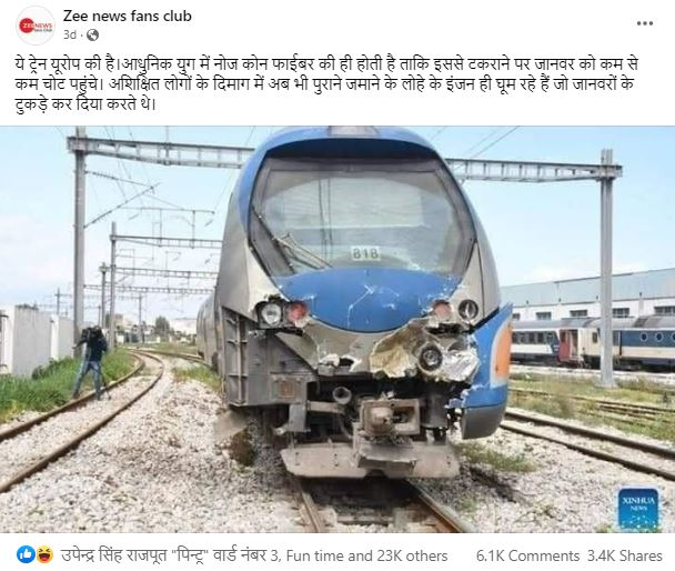 पिछले दिनों वंदे भारत एक्सप्रेस एक हादसे का शिकार हो गई थी, जिसके बाद सोशल मीडिया पर एक क्षतिग्रस्त ट्रेन की तस्वीर वायरल है। दावा किया जा रहा है कि ये ट्रेन यूरोप की है और इसका अगला भाग फाइबर का बना है, जिससे यदि कोई जानवर टकराएगा तो उसे कम से कम चोट लगेगी।