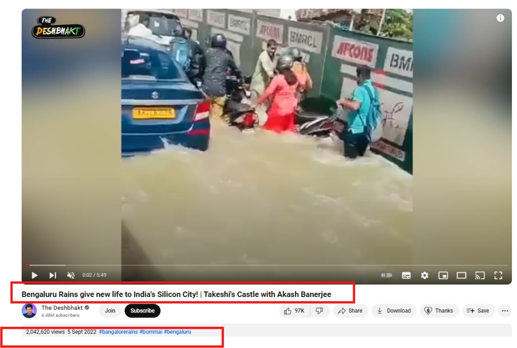 आकाश बनर्जी के यूट्यूब चैनल द देशभक्त ने सितंबर 2022 को एक वीडियो भी पोस्ट किया था, जिसमें बारिश के बाद बेंगलुरु की स्थिति को दिखाया गया है। विवरण में कहा गया है, “कुछ घंटों की बारिश और भारत के सिलिकॉन सिटी को एक नया रूप और पहचान मिल गई है।”