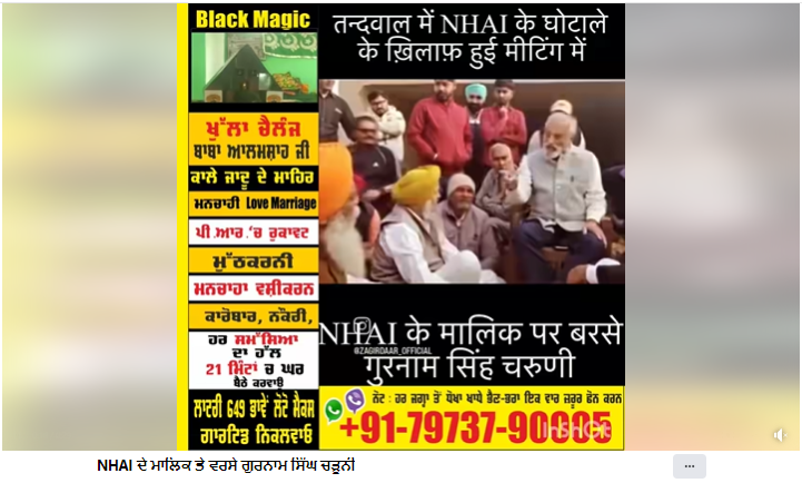इस दावे की जांच के लिए सबसे पहले हमने वीडियो के की-फ्रेम्स को गूगल रिवर्स इमेज सर्च किया। परिणाम में हमें दावे में दिख रही वीडियो के साथ कई सोशल मीडिया पोस्ट मिले। 14 फरवरी 2024 को Punjabi Page नामक फेसबुक पेज द्वारा इस वीडियो के साथ शेयर की गयी पोस्ट में बताया गया है कि यह तन्दवाल में NHAI के घोटाले से जुड़ी हुई है। इस कैप्शन में किसान नेता गुरनाम सिंह चरुणी का नाम भी आता है।