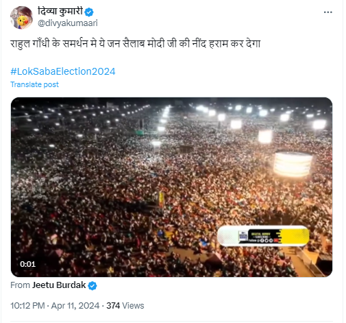 वायरल वीडियो के साथ कैप्शन में लिखा गया है कि ”राहुल गाँधी के समर्थन मे ये जन सैलाब मोदी जी की नींद हराम कर देगा #LokSabaElection2024”। एक्स पोस्ट का आर्काइव यहां देखा जा सकता है।