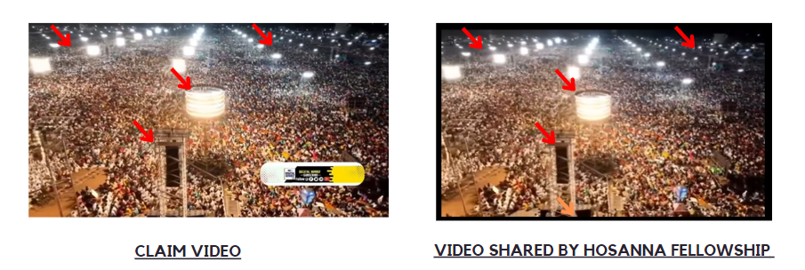 प्राप्त वीडियो और वायरल क्लिप के दृश्यों का मिलान करने पर हमने पाया कि दोनों वीडियो एक ही स्थान के हैं। ‘होसन्ना फ़ेलोशिप’ नामक फेसबुक पेज द्वारा किये गए पोस्ट के कैप्शन में ‘होसन्ना मिनिस्ट्रीस की ओर से टैबरनेकल के 47वें अंतर्राष्ट्रीय पर्व को सफलतापूर्वक पूरा करने के लिए गौरव’ लिखा हुआ है।