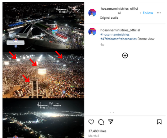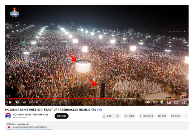 जांच में हमें होसन्ना मिनिस्ट्रीस ऑफिसियल नामक यूट्यूब चैनल पर 13 मार्च 2024 को अपलोड किया गया वीडियो मिला। इस वीडियो में भी वायरल वीडियो के समान भीड़ के बीच में लाइटें उसी स्थान पर नज़र आती हैं। वीडियो के कैप्शन में भी इसे ‘होसन्ना मिनिस्ट्रीस का 47वां टैबरनेकल पर्व बताया गया है।