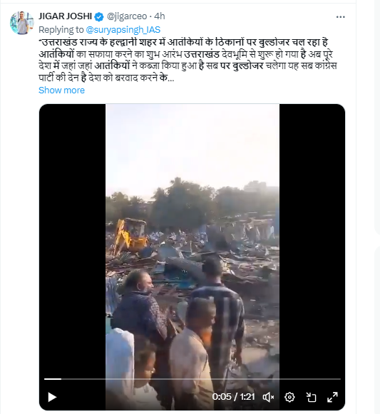1 मिनट 21 सेकेंड लम्बे इस वीडियो को एक्स (पूर्व में ट्विटर) पर शेयर किया गया है। इस वीडियो में दिख रहा है कि कई बुलडोजरों द्वारा मकानों को तोड़ा जा रहा है और दूर-दूर तक टूटे हुए घरों का मलबा बिखरा हुआ है। वीडियो के साथ कैप्शन में लिखा हुआ है, ”उत्तराखंड राज्य के हल्द्वानी शहर में आतंकियों के ठिकानों पर बुल्डोजर चल रहा है आतंकियों का सफाया करने का शुभ आरंभ उत्तराखंड देवभूमि से शुरू हो गया है। अब पूरे देश में जहां जहां आतंकियों ने कब्जा किया हुआ है सब पर बुल्डोजर चलेगा।”