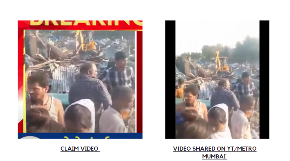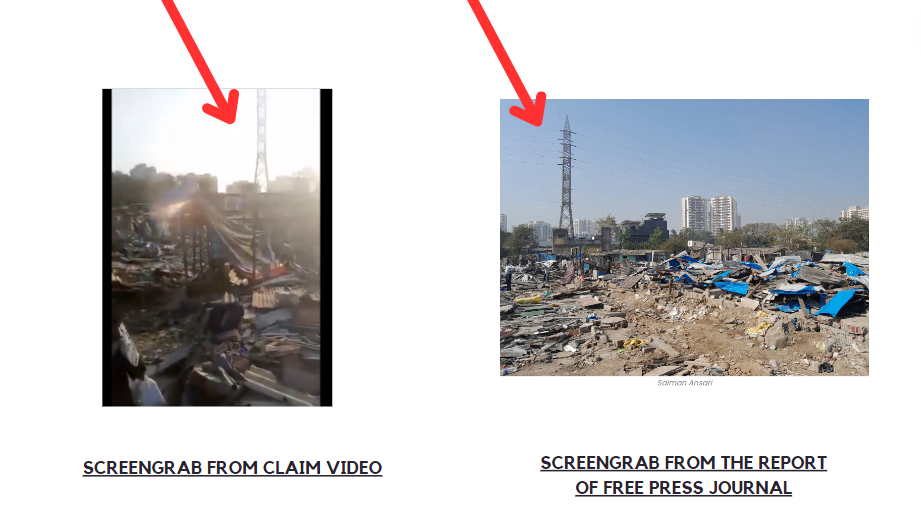 इसके बाद हमने मुंबई नगर निगम द्वारा झोपड़ियों पर बुलडोजर चलाये जाने से जुड़ी और जानकारी खोजी। हमें इसी वीडियो के साथ यूट्यूब पर मेट्रो मुंबई द्वारा 12 फरवरी को प्रकाशित एक वीडियो रिपोर्ट मिली, जिसके अनुसार 6-7 फरवरी को मुंबई के गोवंडी इलाके में करीब 450 से 500 झोपड़ियों पर बीएमसी ने बुलडोज़र चला दिया था। अब हमने रिपोर्ट में मौजूद वीडियो और वायरल वीडियो के दृश्यों का तुलनात्मक विश्लेषण किया, जिसे नीचे तस्वीरों में देखा जा सकता है।