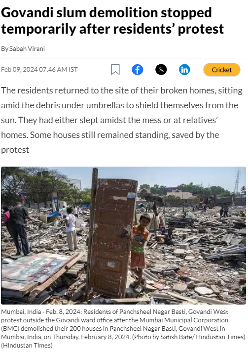 इस रिपोर्ट में बताया गया है कि निवासियों के प्रदर्शन के बाद, बस्ती को तोड़ने का काम सात दिनों के लिए अस्थायी रूप से रोक दिया गया। बतौर रिपोर्ट्स, निगम ने कथित तौर पर बिना किसी नोटिस के 6 और 7 फरवरी को गोवंडी इलाके में झोपड़ियों पर बुलडोजर चलाकर उन्हें तोड़ दिया था, जिससे 1,000 से अधिक लोग बेघर हो गए।