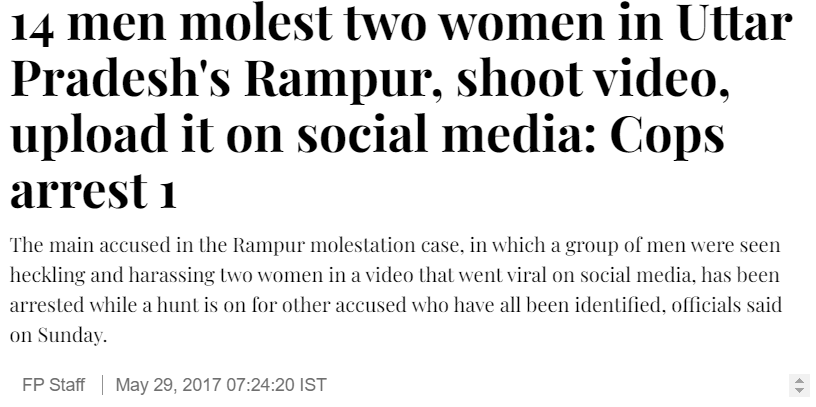 29 मई 2017 को प्रकाशित आज तक’ की एक रिपोर्ट में बताया गया है कि पीड़िता अपने भाई के साथ बाजार गई थी और वापस लौटते समय वे एक पेट्रोल पंप पर रुके थे। इस दौरान जब महिलाएं टॉयलेट के लिए पास के जंगल में गईं, तब उनके साथ बदसुलूकी की घटना हुई। प्रभात खबर में प्रकाशित रिपोर्ट के अनुसार, रामपुर के थाना टांडा क्षेत्र की इस घटना में यूपी पुलिस ने मुख्य आरोपी सहित अन्य 4 आरोपियों को गिरफ्तार कर लिया था, जबकि 10 आरोपियों की तलाश की जा रही थी।