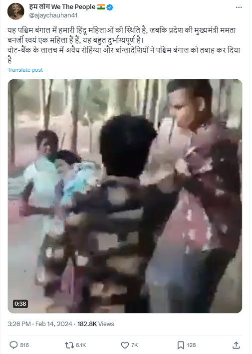 14 फरवरी 2024 को @ajaychahan41 नामक एक एक्स अकाउंट ने इस वीडियो को शेयर करते हुए लिखा है कि ‘यह पश्चिम बंगाल में हमारी हिंदू महिलाओं की स्थिति है, जबकि प्रदेश की मुख्यमंत्री ममता बनर्जी स्वयं एक महिला हैं हैं, यह बहुत दुर्भाग्यपूर्ण है।‘ लेख लिखे जाने तक इस पोस्ट को करीब 2 लाख लोगों द्वारा देखा जा चुका है।
