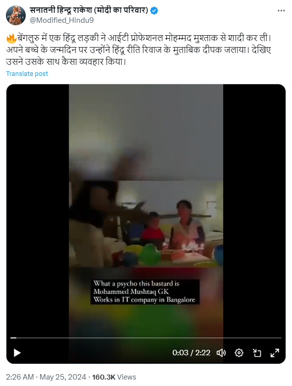 वायरल एक्स पोस्ट में इस वीडियो को शेयर करते हुए कैप्शन में लिखा गया है, ”बेंगलुरु में एक हिंदू लड़की ने आईटी प्रोफेशनल मोहम्मद मुश्ताक से शादी कर ली। अपने बच्चे के जन्मदिन पर उन्होंने हिंदू रीति रिवाज के मुताबिक दीपक जलाया। देखिए उसने उसके साथ कैसा व्यवहार किया।” एक्स पोस्ट का आर्काइव यहाँ देखें।