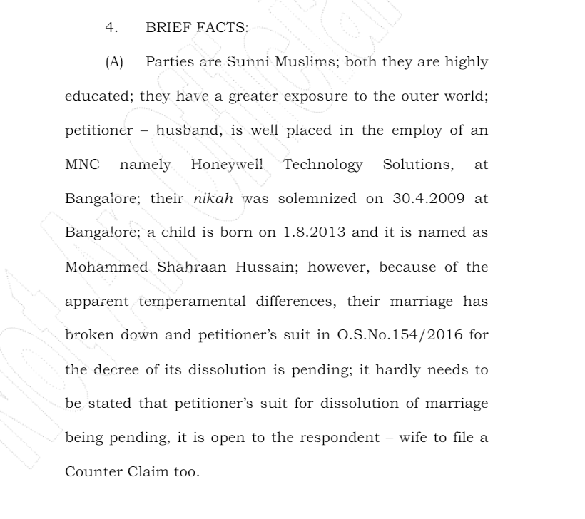 पड़ताल में आगे हमने पाया कि आयशा बानो के पति मोहम्मद मुश्ताक ने कर्नाटक उच्च न्यायालय में बच्चे की कस्टडी के लिए याचिका दायर की थी, लेकिन 21 दिसंबर, 2021 के आदेश में मोहम्मद मुश्ताक की याचिका को खारिज कर दिया गया और उसे आयशा को मुआवजे में 50,000 रुपये देने का निर्देश मिला। इस कोर्ट ऑर्डर में पृष्ठ तीन पर बताया गया है कि मोहम्मद मुश्ताक और आयशा बानो दोनों ही सुन्नी मुसलमान हैं। कोर्ट के आदेश में धर्म के आधार पर घरेलू हिंसा होने का कोई जिक्र नहीं है।