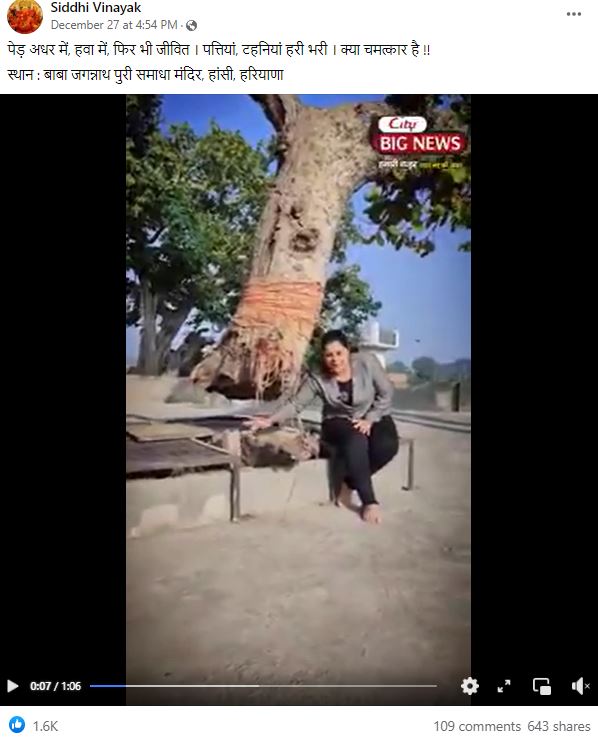 दावे की सत्यता जानने के लिए वायरल वीडियो के एक कीफ्रेम को गूगल रिवर्स सर्च किया। हमें फेसबुक पर City Big News के फेसबुक पर वायरल वीडियो का लंबा वर्जन मिला। वीडियो के अनुसार, यह पेड़ हरियाणा के हिसार जिले के हांसी में मौजूद समाधा मंदिर के प्रांगण में स्थित है। इसमें वायरल वीडियो में नज़र आ रही महिला करीब 2:09 मिनट पर बता रही है कि कुछ लोग इसे अजूबा नहीं मानते हैं। उसके बाद वो महिला वायरल वीडियो में नज़र आ रहे पेड़ के बगल में मौजूद एक दूसरे पेड़ को दिखाती है। साथ ही बताती है कि हवा में लटके हुए पेड़ की टहनी बगल में मौजूद दूसरे पेड़ में अटकी हुई है, जिससे पेड़ को मिट्टी और अन्य पोषक तत्व मिल जाते हैं। वायरल वीडियो में इस हिस्से को काटकर शेयर किया जा रहा है।