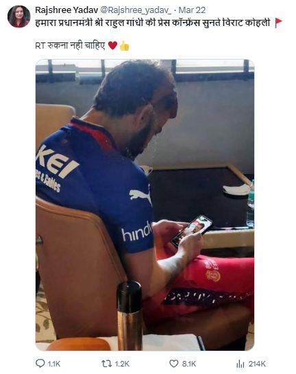 22 मार्च 2024 को राजश्री यादव नामक एक्स यूज़र ने एक पोस्ट के जरिये विराट कोहली की इस तस्वीर को शेयर करते हुए कैप्शन में लिखा है कि ”हमारा प्रधानमंत्री श्री राहुल गांधी की प्रेस कॉन्फ्रेंस सुनते विराट कोहली।”