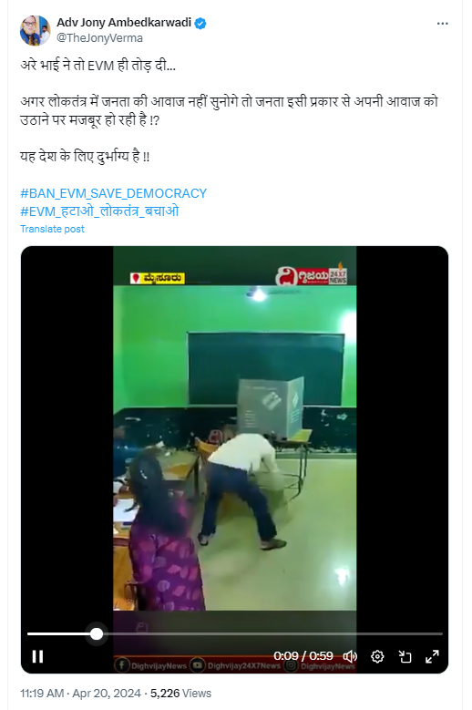 हमारी जांच में मिले साक्ष्यों से यह साफ़ है कि सोशल मीडिया पर वायरल हो रहा दावा भ्रामक है। व्यक्ति द्वारा ईवीएम तोड़े जाने की यह घटना साल 2023 की है।