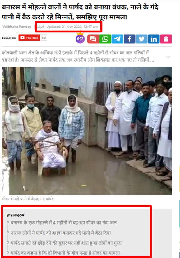 वायरल वीडियो को लेकर नवभारत टाइम्स द्वारा 21 नवंबर, 2020 को प्रकाशित एक लेख के अनुसार, यह वीडियो वाराणसी के कोतवाली थाना क्षेत्र के अम्बिया मंडी इलाके का है, जहां 4 महीनों तक जलजमाव की समस्या झेलने के बाद स्थानीय लोगों ने गलियों में घूम रहे पार्षद को बंधक बनाकर नाले के पानी के बीच बैठा दिया था.