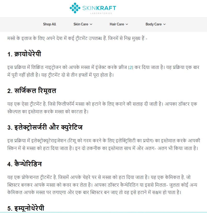 पड़ताल के दौरान हमें skinkraft.com की वेबसाइट पर भी इससे जुड़ी रिपोर्ट मिली. इस रिपोर्ट में भी मस्से को हटाने के क्लिनिकल तरीके जैसे क्रायोथेरेपी, सर्जिकल रिमूवल, इलेक्ट्रोसर्जरी और क्युरेटिज, कैन्थेरिडिन इत्यादि का ज़िक्र किया गया था. साथ ही रिपोर्ट में कुछ घरेलू तरीके भी बताए गए हैं, लेकिन इन सभी घरेलू नुस्खों से जल्दी उपचार होने की संभावना नहीं बताई गई है.