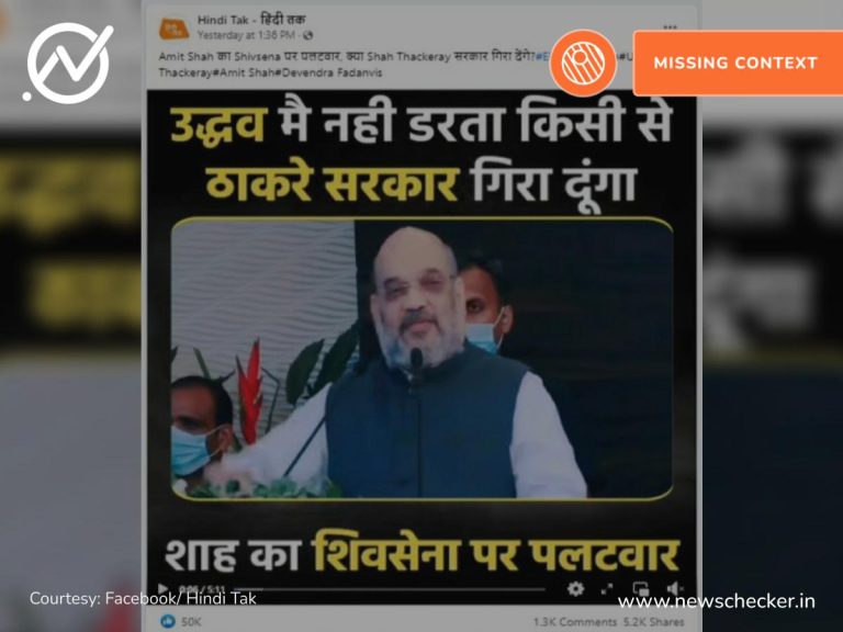 सोशल मीडिया पर एक वीडियो को शेयर कर दावा किया गया कि अमित शाह ने शिव सेना पर पलटवार करते हुए कहा कि वे उद्धव ठाकरे की सरकार को गिरा देंगे। हमारी पड़ताल में यह दावा भ्रामक साबित हुआ। पूरा फैक्ट चेक यहां पढ़ा जा सकता है।