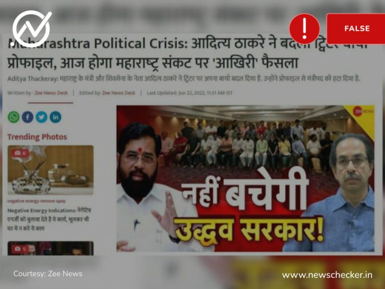 सोशल मीडिया सहित कई मीडिया संस्थानों द्वारा दावा किया जाने लगा कि महाराष्ट्र में चल रहे सियासी संकट के बीच आदित्य ठाकरे ने अपने ट्विटर बायो से मंत्री शब्द हटा दिया है। हमारी पड़ताल में यह दावा फर्जी साबित हुआ। पूरा फैक्ट चेक यहां पढ़ा जा सकता है।