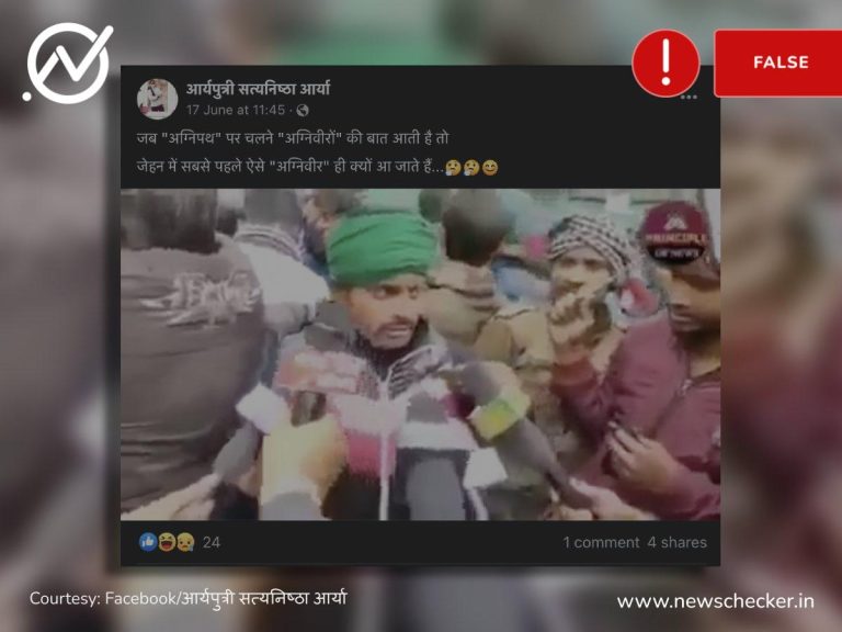सोशल मीडिया पर एक वीडियो शेयर कर इसे अग्निपथ योजना के खिलाफ चल रहे विरोध प्रदर्शन का बताया गया। हमारी पड़ताल में यह दावा फर्जी साबित हुआ। पूरा फैक्ट चेक यहां पढ़ा जा सकता है।
