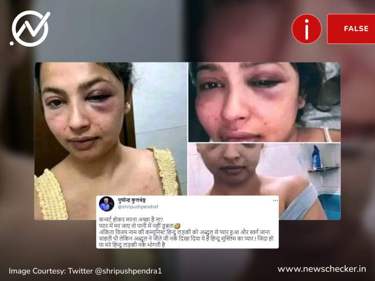 सोशल मीडिया पर कुछ तस्वीरों का एक कोलॉज शेयर कर दावा किया जाने लगा कि एक हिन्दू युवती की उसके मुस्लिम बॉयफ्रेंड ने पिटाई कर दी। हमारी पड़ताल में पता चला कि वायरल तस्वीरों में दिख रही युवती मलयालम अभिनेत्री हैं, और उनके साथ मारपीट करने वाला उनका मित्र मुस्लिम नहीं है। पूरा फैक्ट चेक यहां पढ़ा जा सकता है।