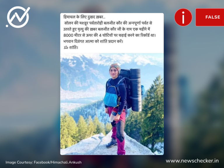 सोशल मीडिया यूजर्स ने एक पोस्ट को शेयर कर दावा किया कि हिमाचल प्रदेश के माउंट अन्नपूर्णा से लापता हुई पर्वतारोही बलजीत कौर की मौत हो गई है। हमारी पड़ताल में यह दावा फर्जी साबित हुआ। फैक्ट चेक यहां पढ़ा जा सकता है।