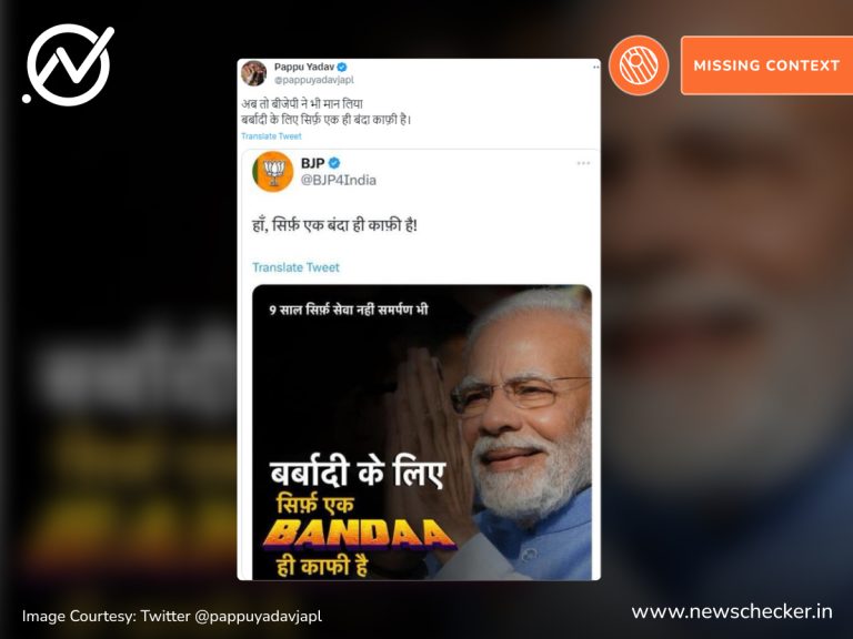 सोशल मीडिया यूजर्स ने एक पोस्ट शेयर कर दावा किया कि भाजपा ने ट्वीट कर प्रधानमंत्री नरेंद्र मोदी को देश की बर्बादी का कारण बताया है। हमारी पड़ताल में यह दावा फर्जी निकला। पूरा फैक्ट चेक यहां पढ़ें।